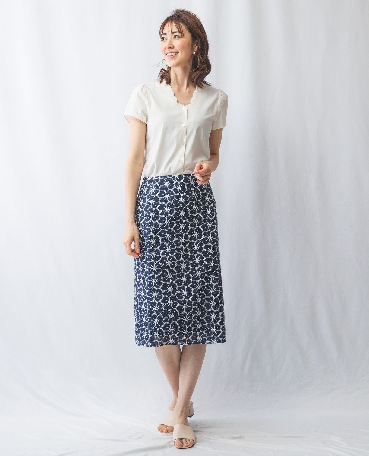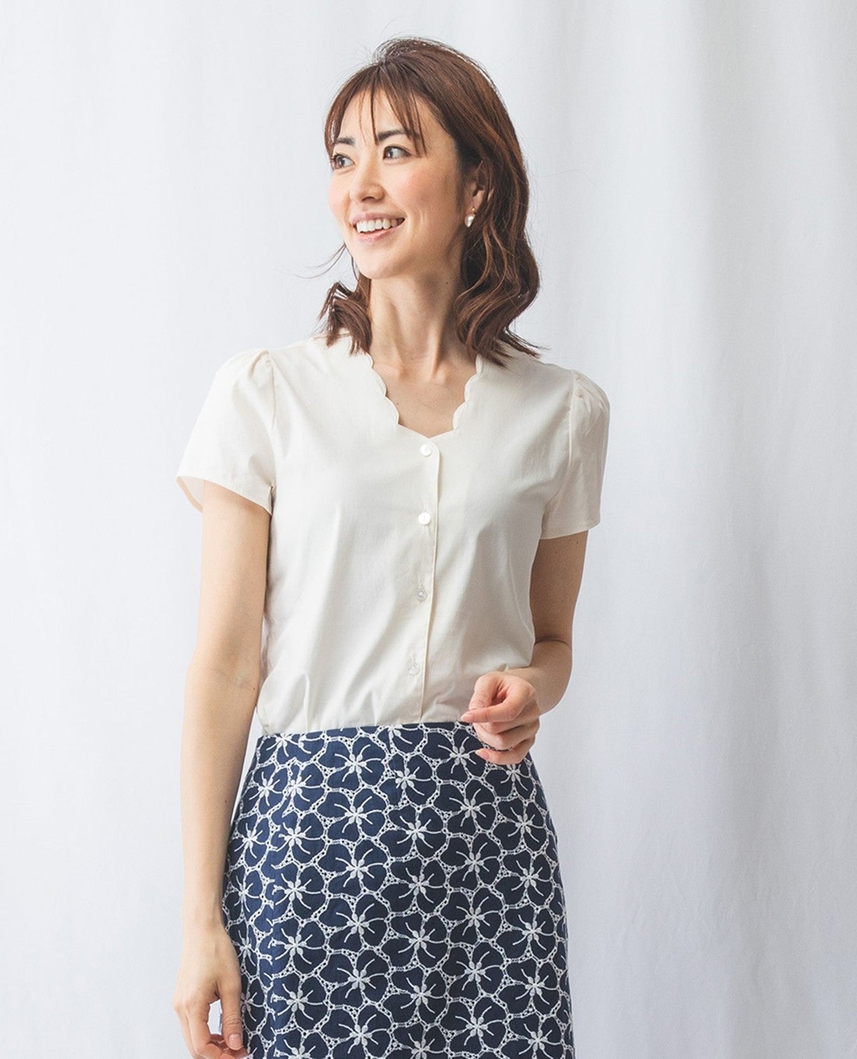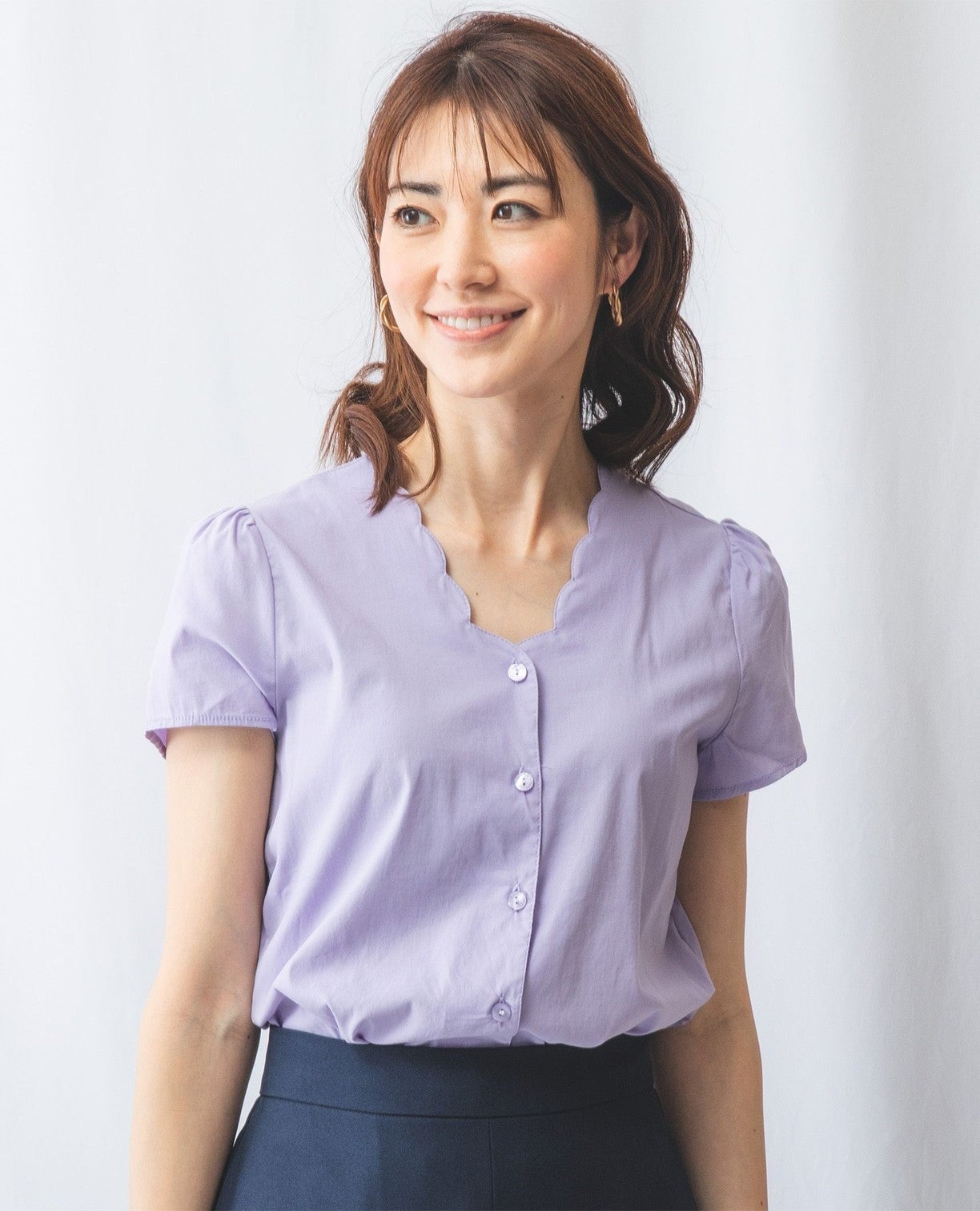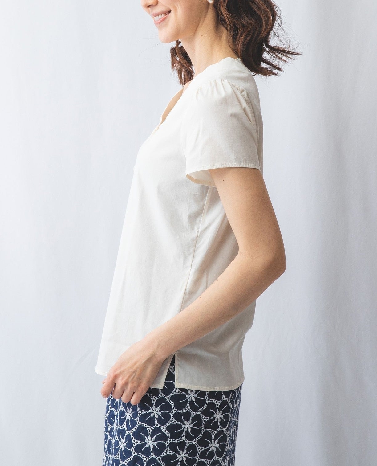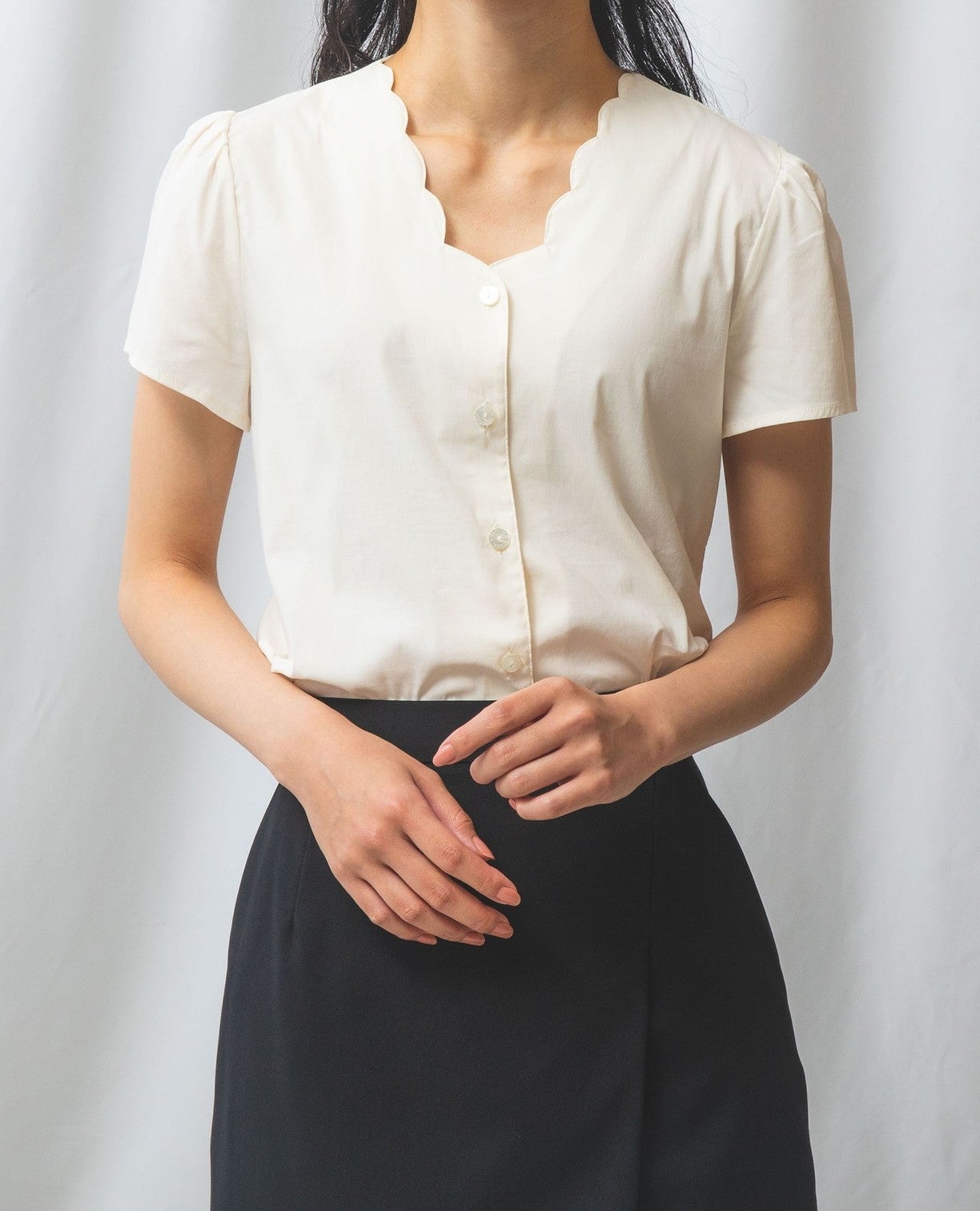 コットンストレッチスカラップネックブラウス