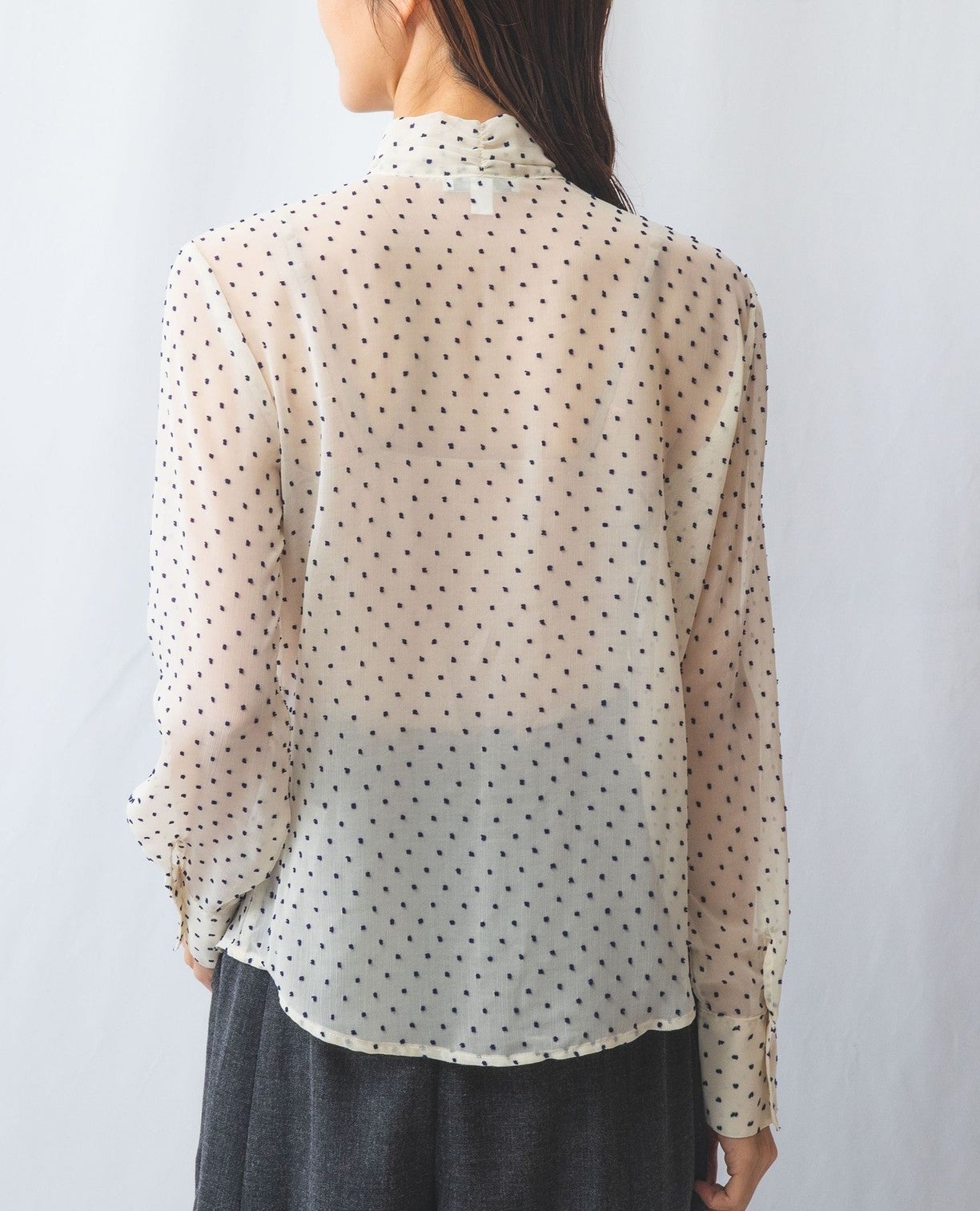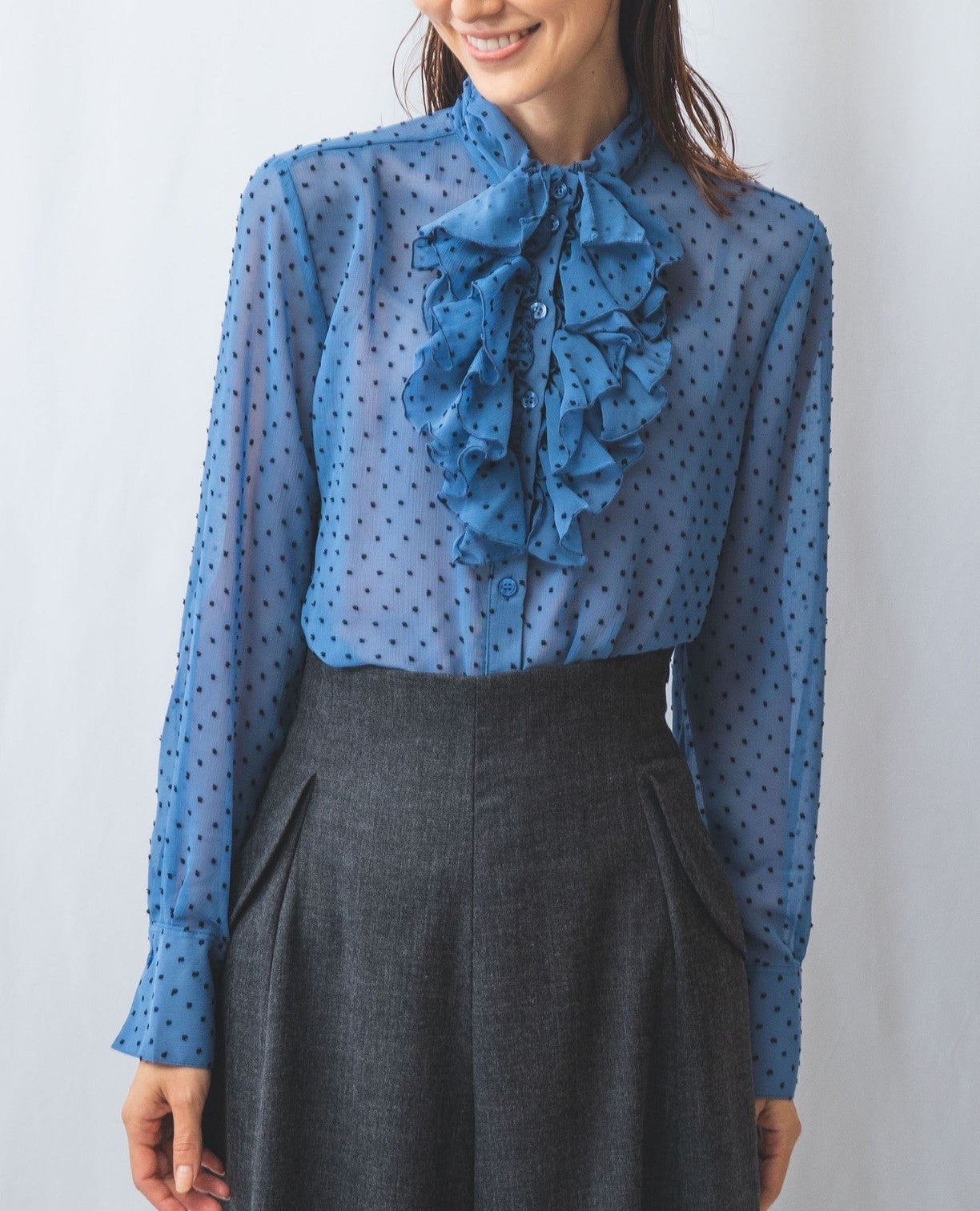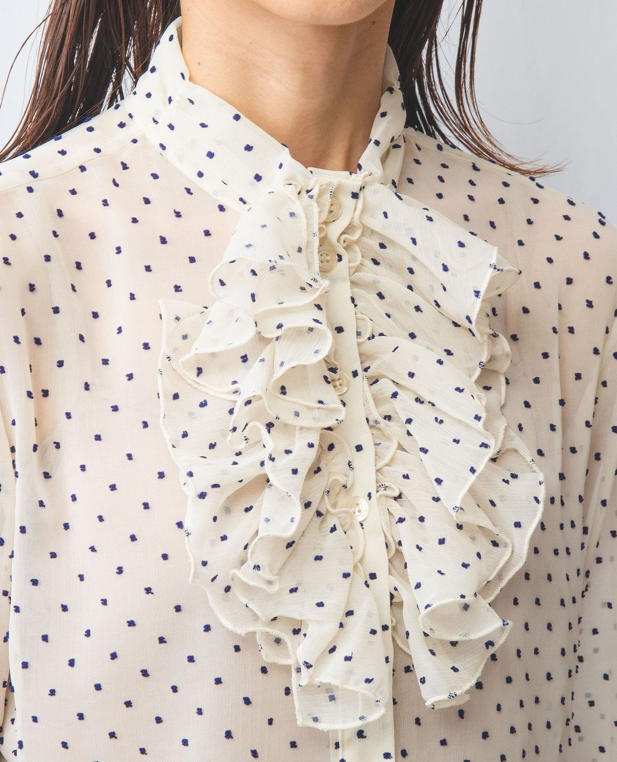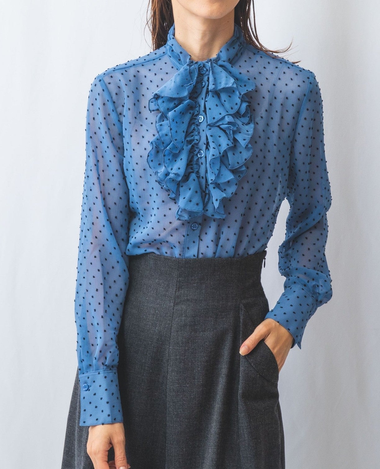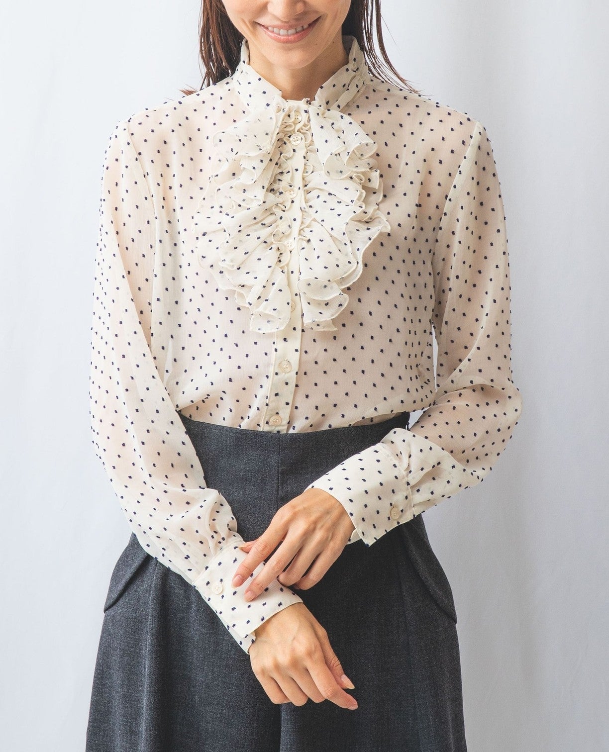 ドットジャガードスタンドフリルブラウス