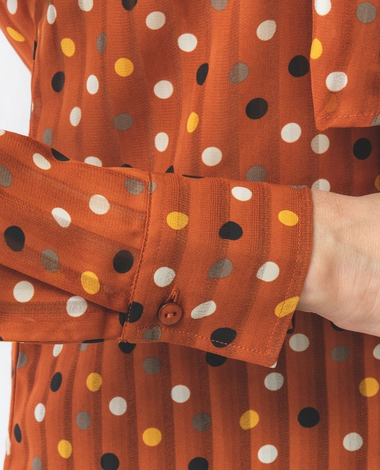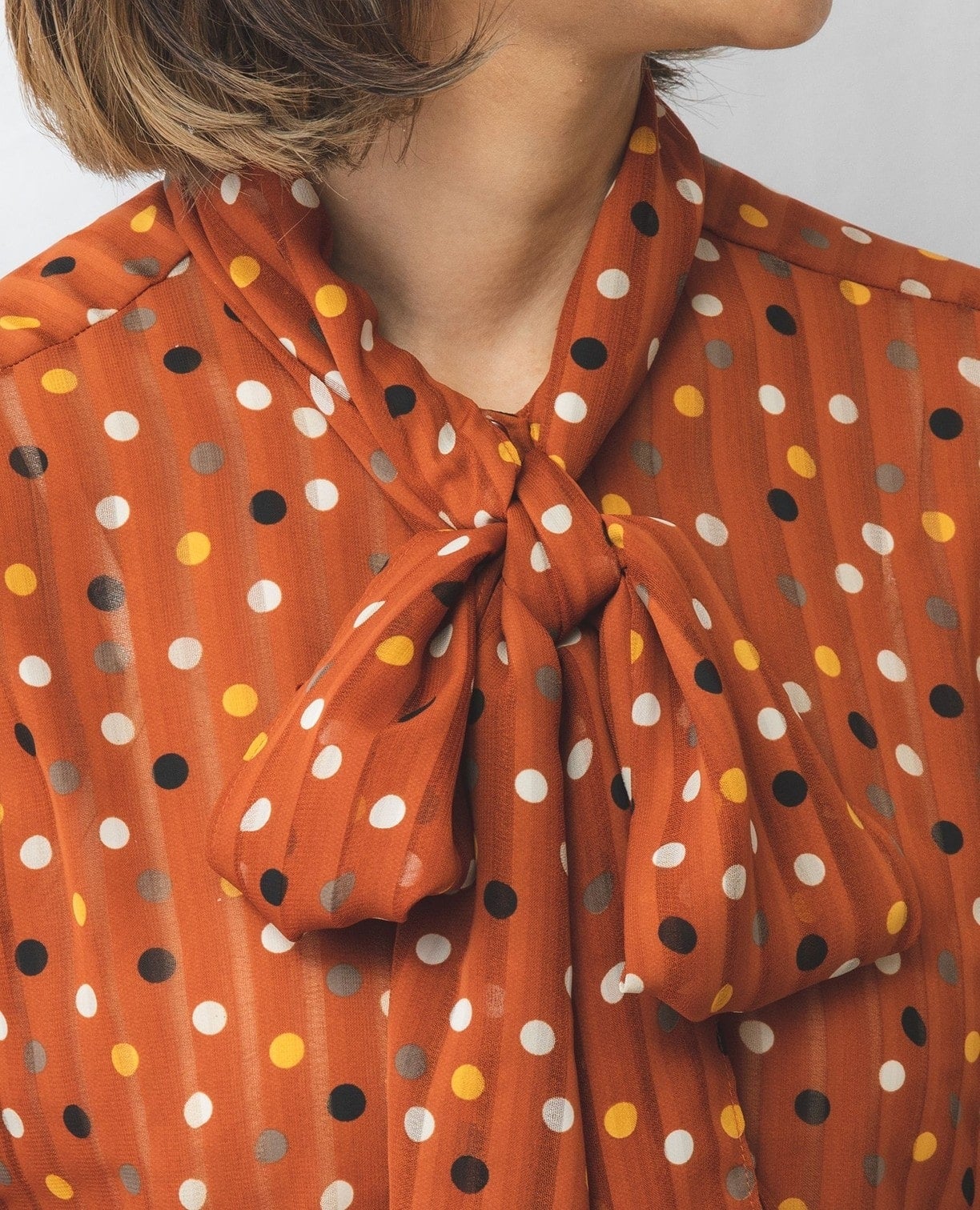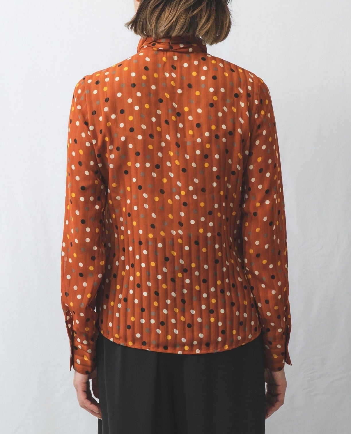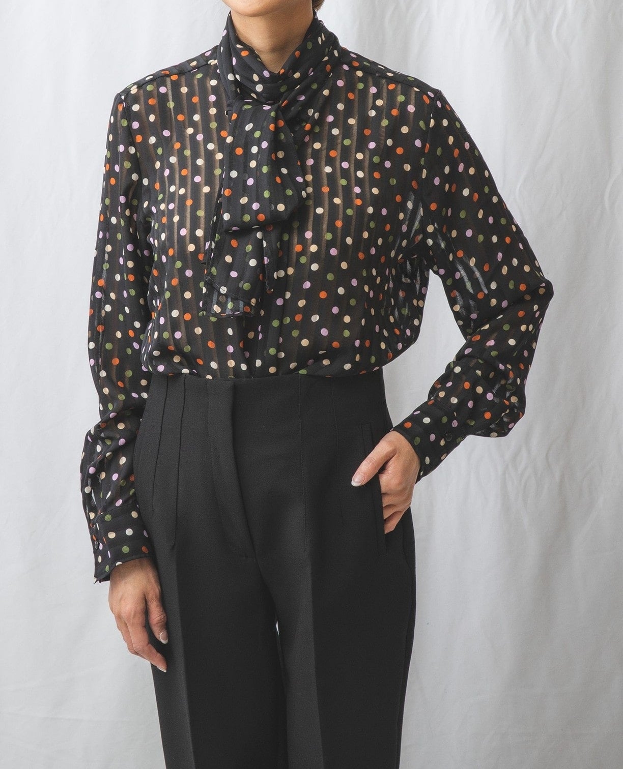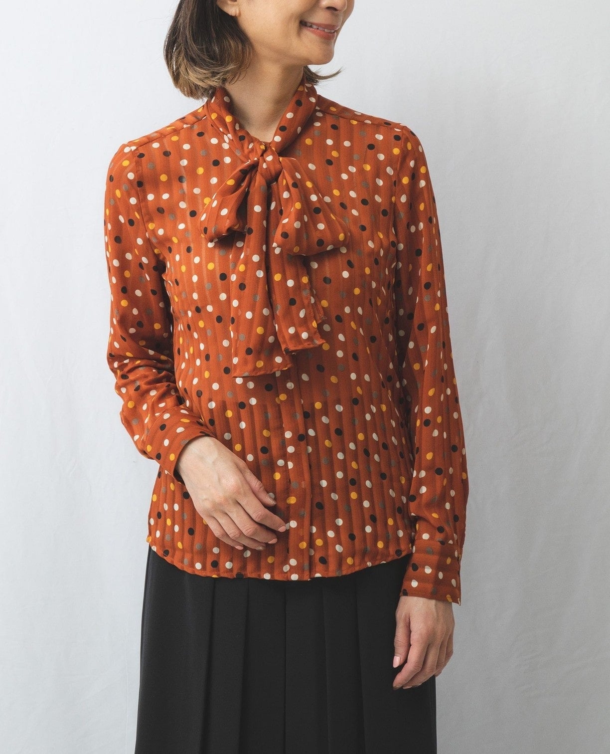 シャドーストライプカラードットプリントボウタイ長袖ブラウス