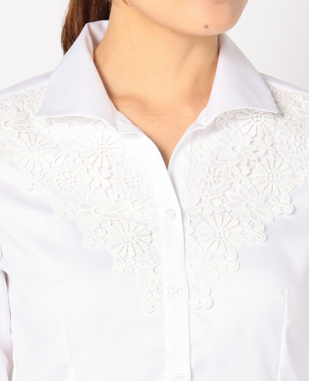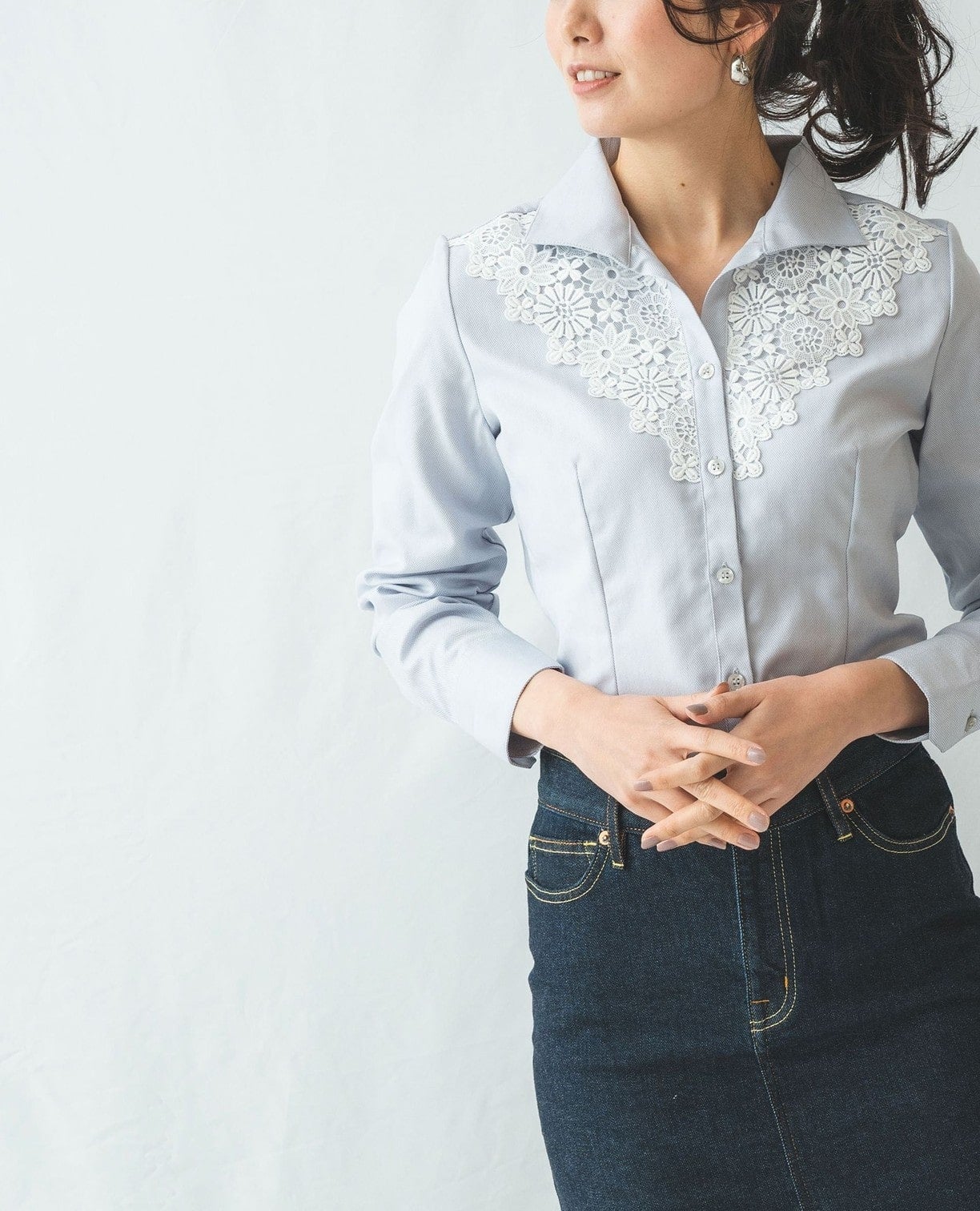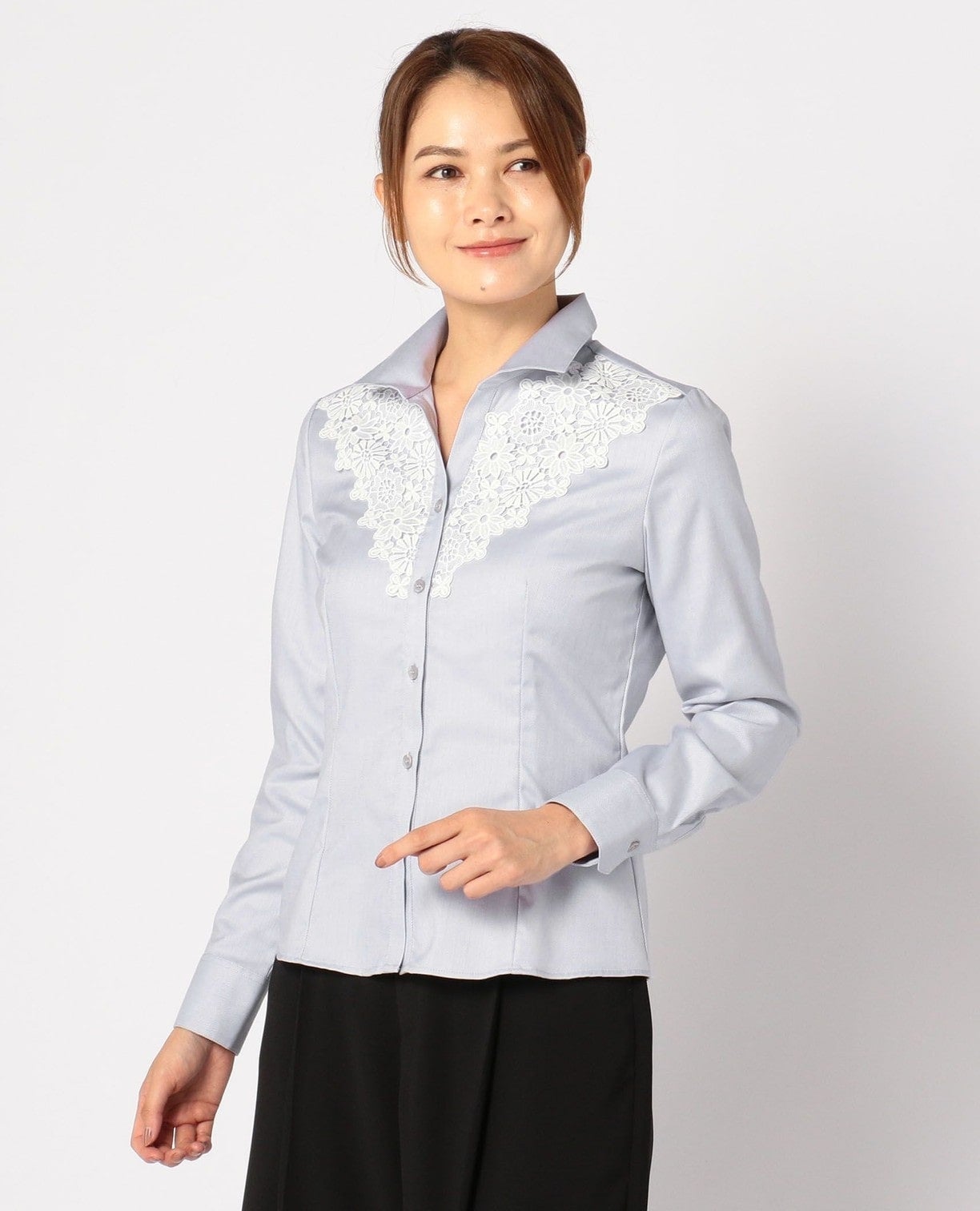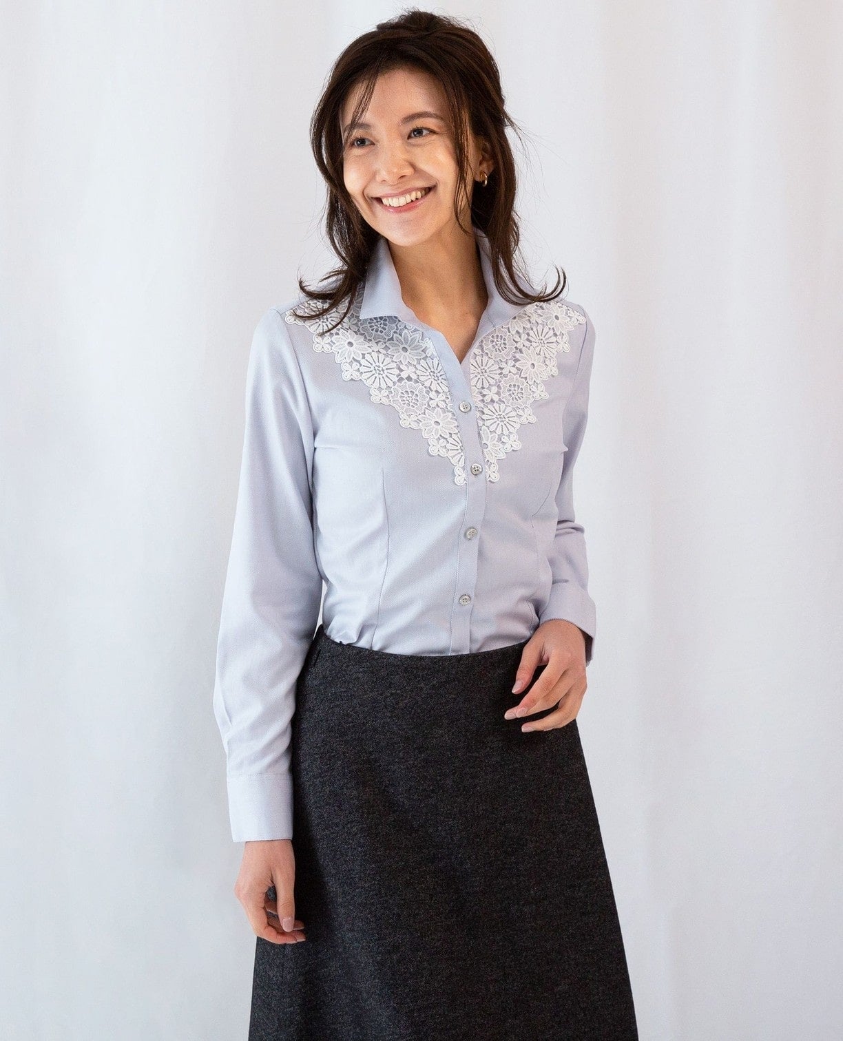 先染めへリーンボーン胸元レース使い長袖ブラウス
