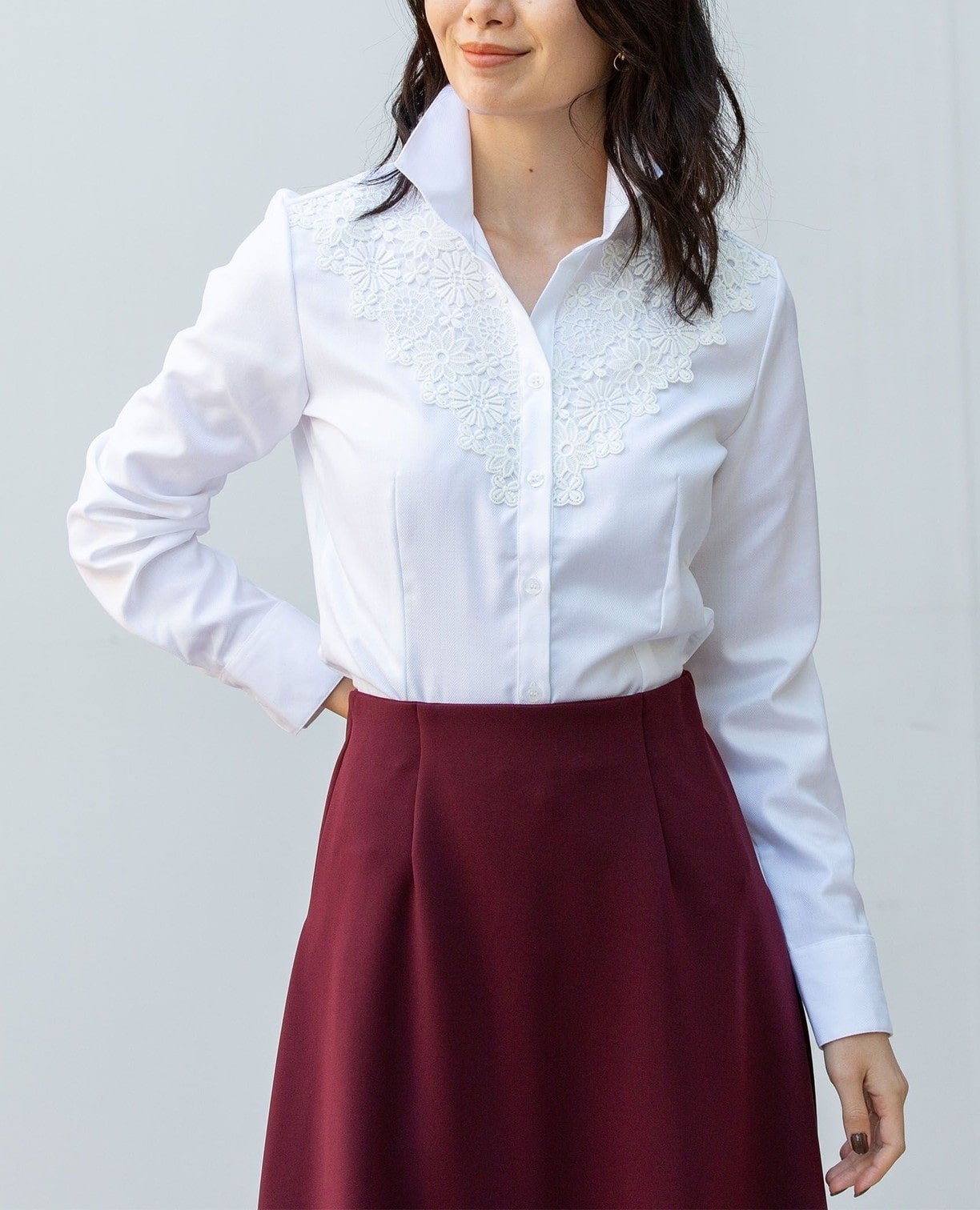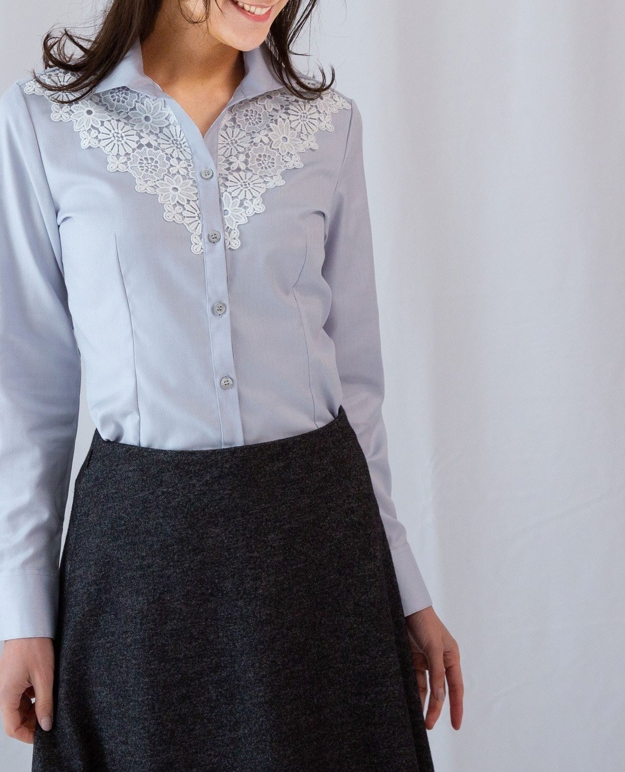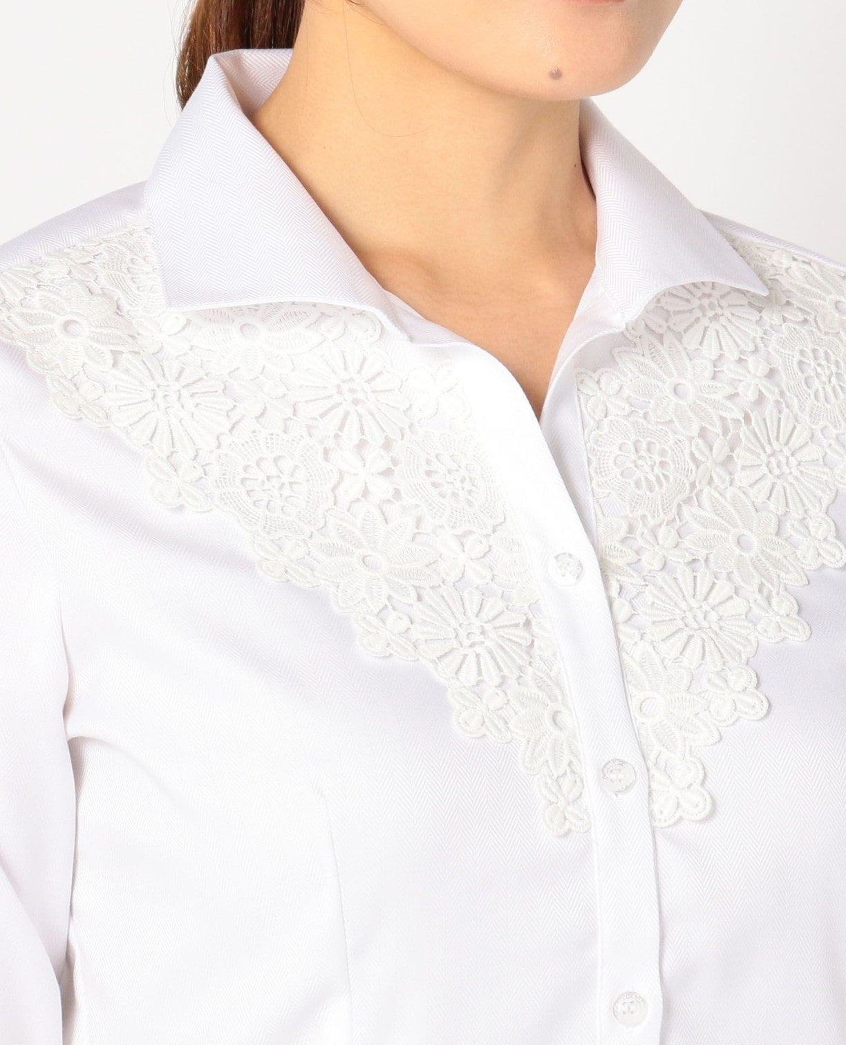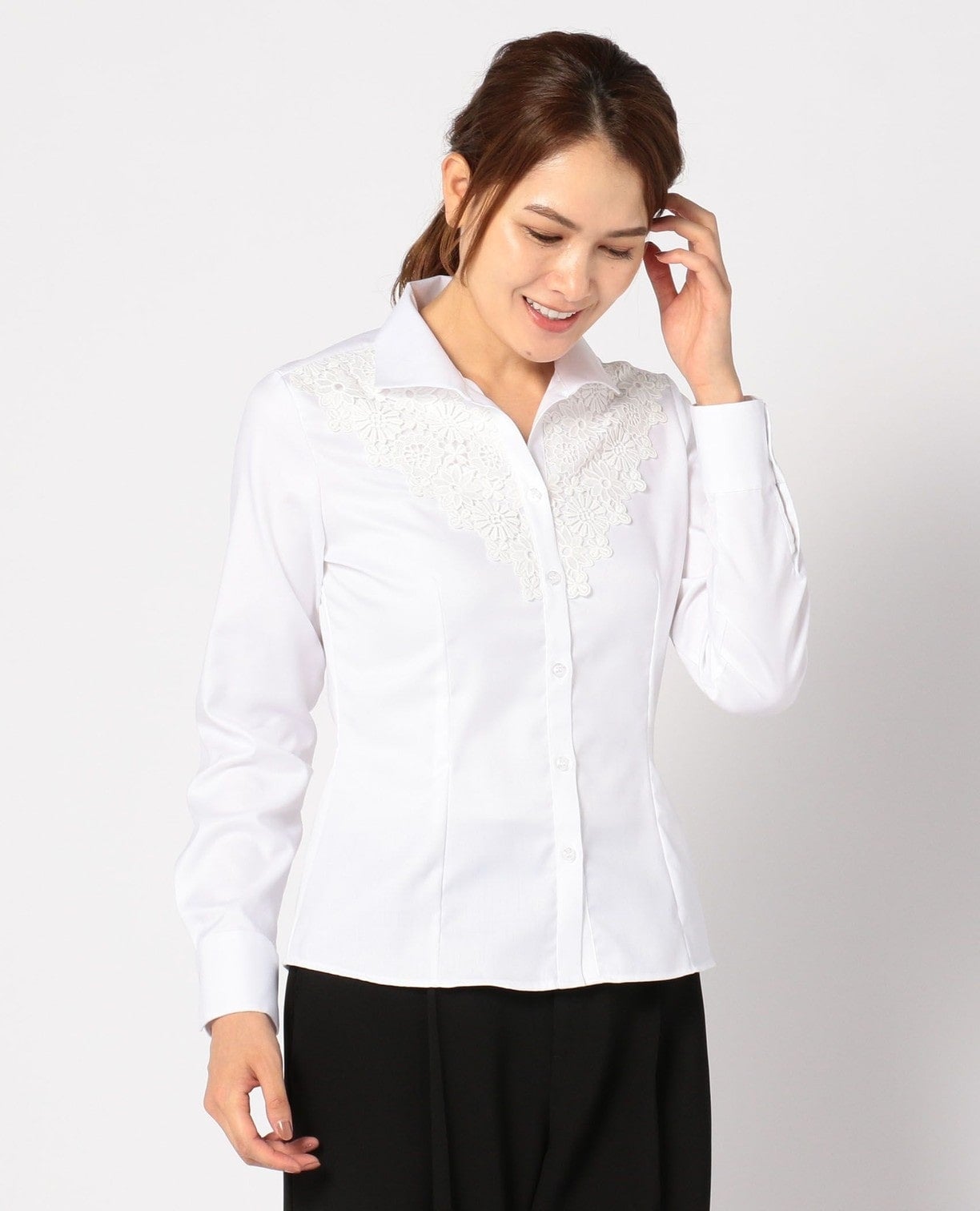 先染めへリーンボーン胸元レース使い長袖ブラウス