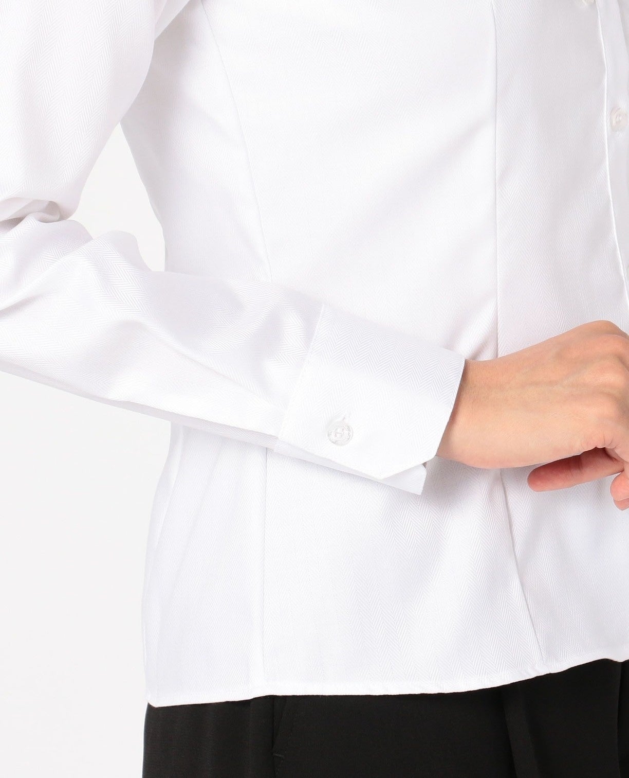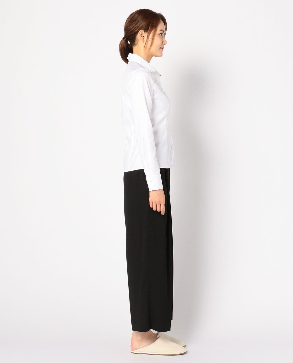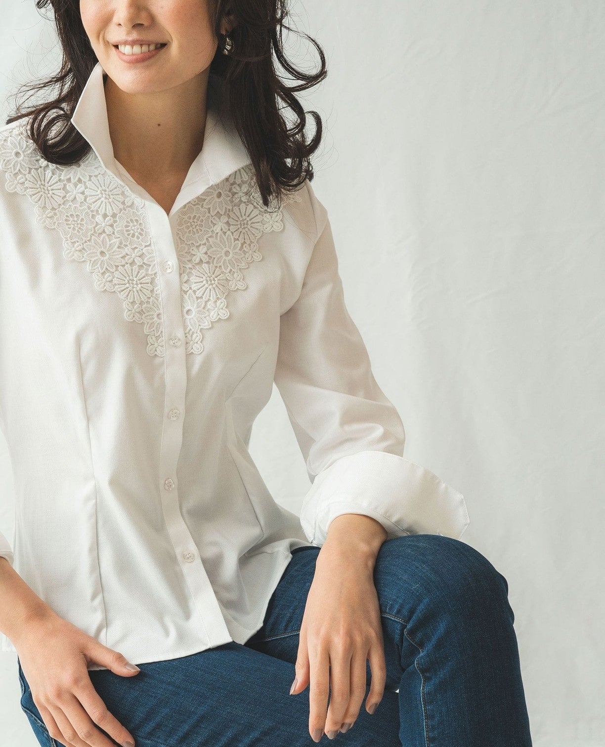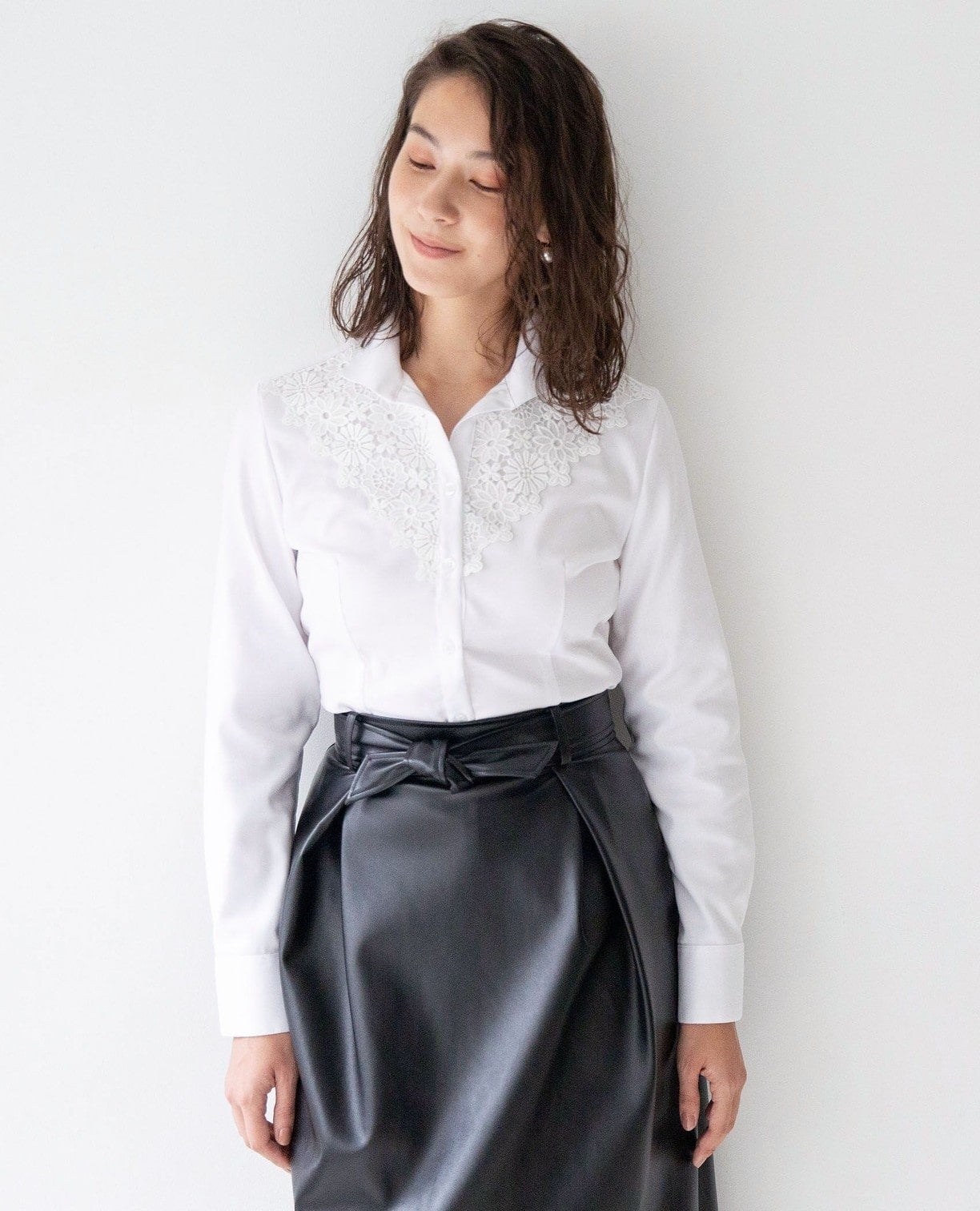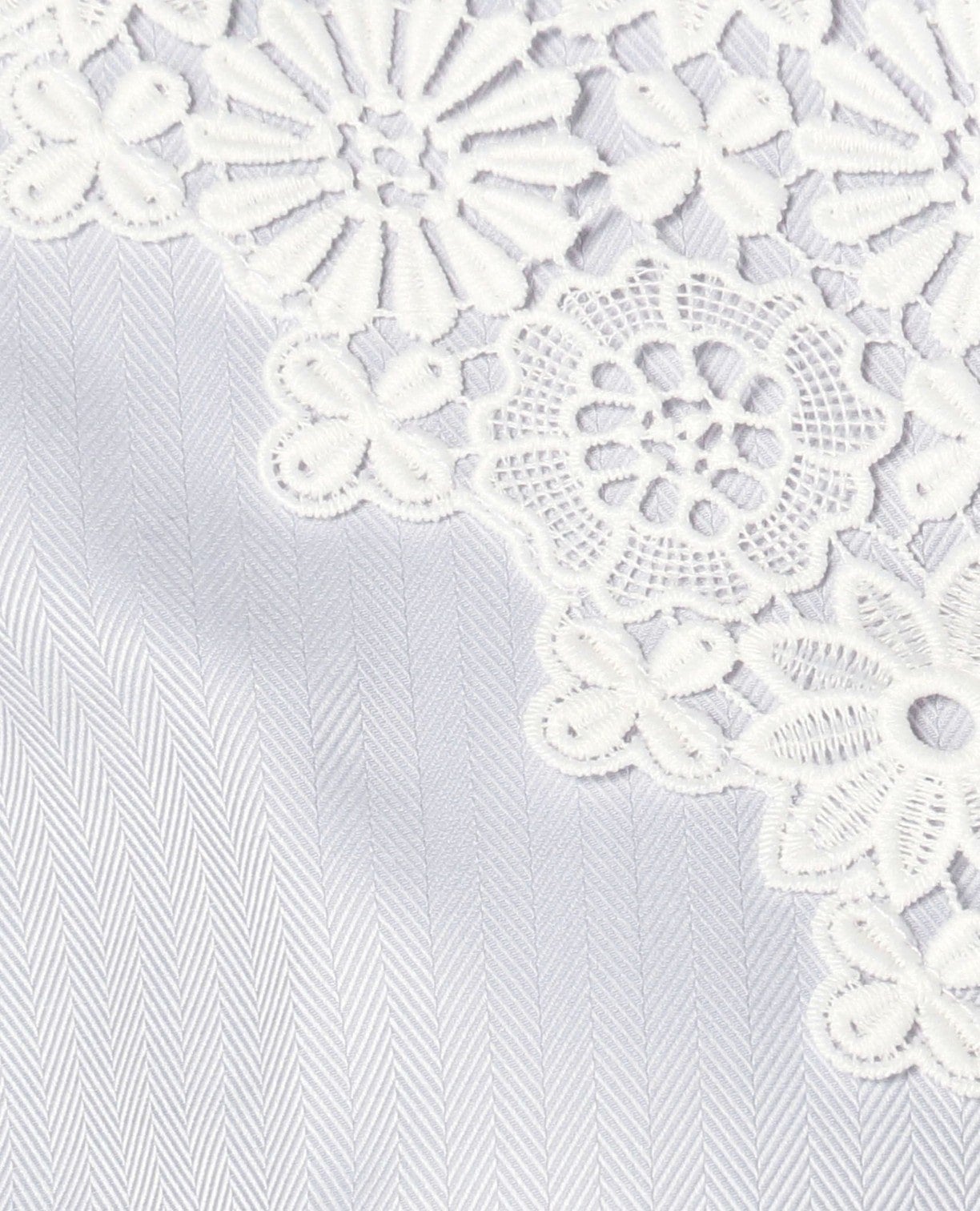 先染めへリーンボーン胸元レース使い長袖ブラウス